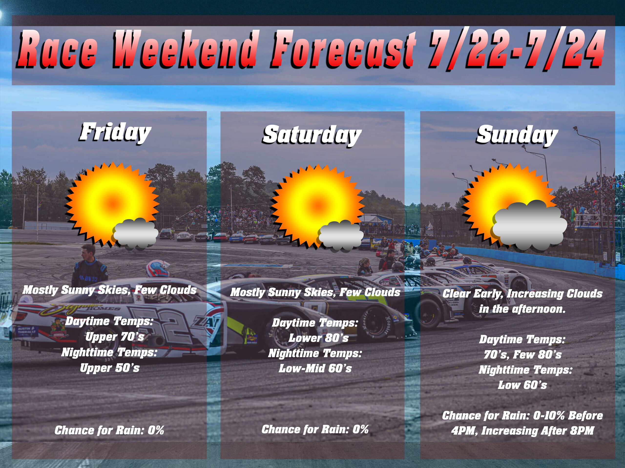 Column By: Stephen Durham / RPW – OXFORD, M.E – It has been a year of battles with the weather across the Northeast and New England, as Mother Nature has played a role in many race weekends. For the ACT Tour, Saturday looks like a beautiful warm Saturday, with a fair weather day shaping up for the PASS Tour on Sunday as well. As an avid race fan and meteorologist, I am always rooting for the beautiful warm weather days for racing, so here is my forecast outlook for the weekend.
