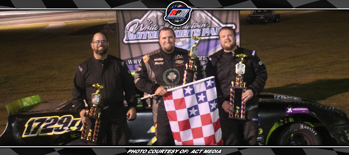 Column By: Cale King / WHITE MOUNTAIN MOTORSPORTS PARK – N. WOODSTOCK, NH – The Dad’s 4 By Tool & Supply Kids Division kicked off Saturday night’s six division card with Chloe Doyle and Bella Hamel leading the way side-by-side at the front. Several back of the pack cautions slowed the pace early but under green flag conditions Lucas Sidney and Owen Dupuis made their way through the field to pour the pressure on in the closing laps. Under the twin checkered flags Sidney took the win by a hair over Doyle with Makenzi Sicard sliding in for third to round out the opening podium.